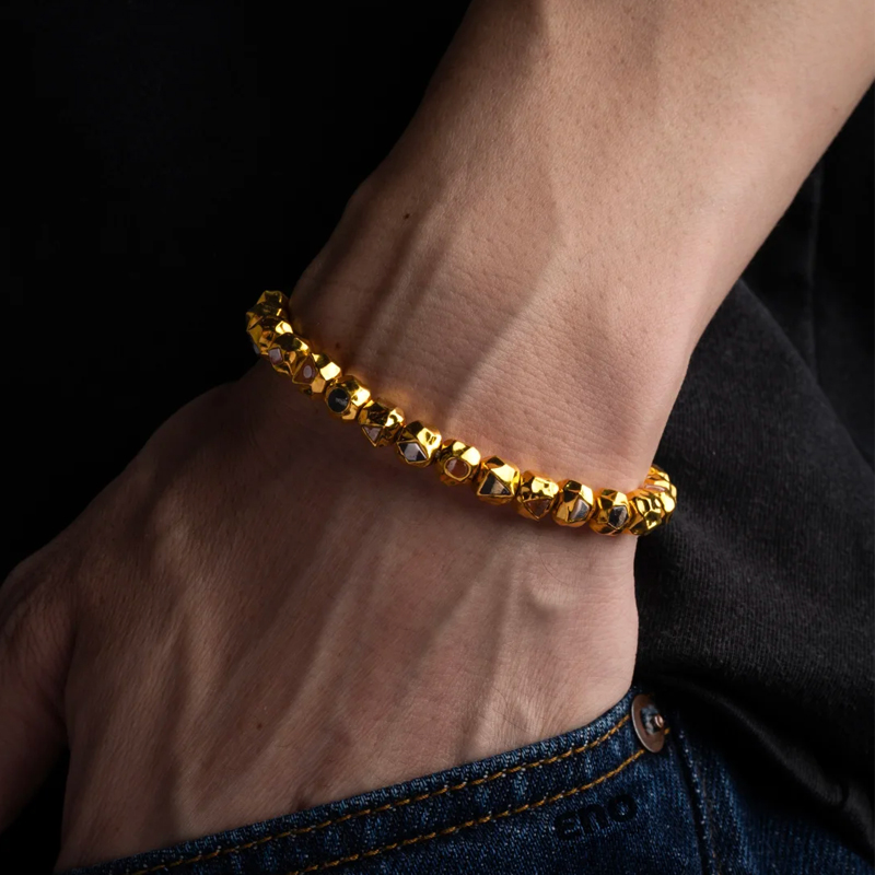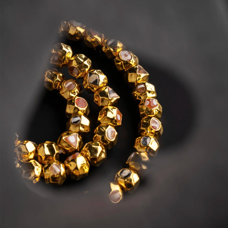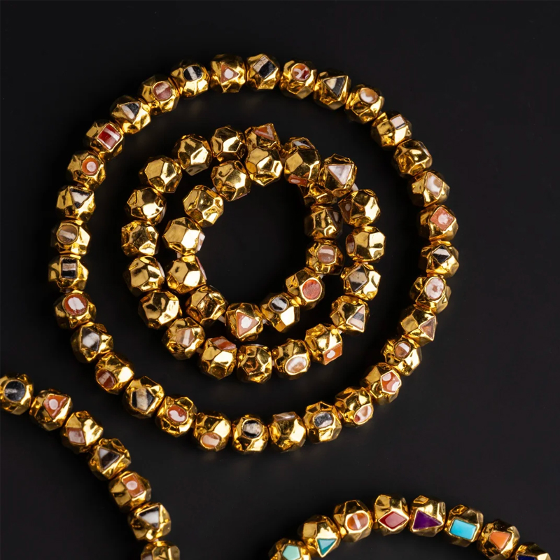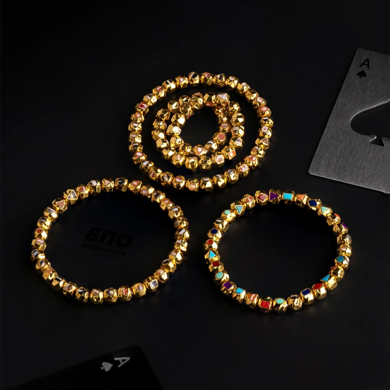 The beads feature a distinctive design: some surfaces employ a special cutting technique, creating multifaceted geometric shapes. This design not only adds depth and dimension to the bracelet but also allows light to undergo multiple reflections and refractions on the bead surfaces. As a result, the bracelet sparkles with an even more dazzling radiance under light, resembling a constellation of twinkling stars in the night sky, captivating the eye. Additionally, some beads are inlaid with colorful enamel or gemstones, enriching the bracelet with vibrant hues and distinctive character. These colorful elements complement the golden base, showcasing the nobility of gold while adding a touch of liveliness and playfulness.