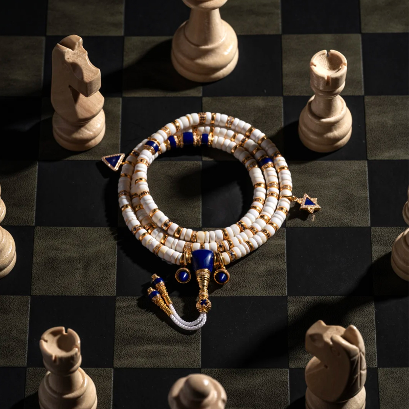 The bracelet’s accessories are masterfully designed, serving as the crowning touch. The blue triangular pendant, with its simple yet distinctive shape, echoes the lapis lazuli’s hue, adding a touch of modern flair and individuality. The white cord knots and tassels at the three-way Buddha head charm sway gently with the wrist’s movement, imparting an air of grace and fluidity that enhances the bracelet’s dynamic beauty.