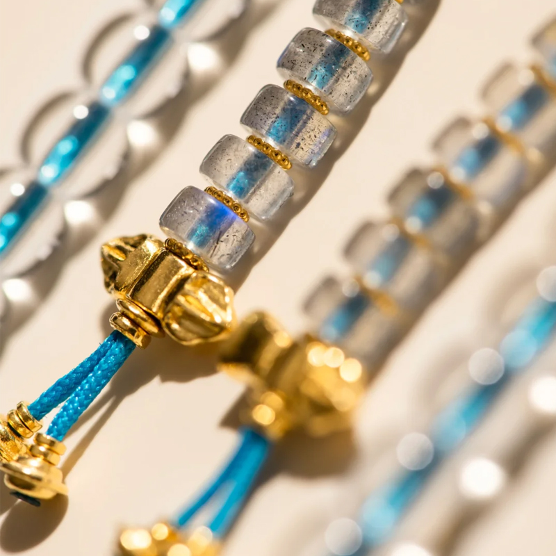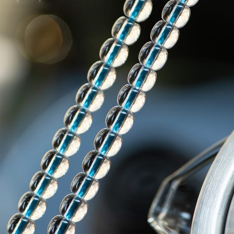 The bracelet’s color scheme is truly exceptional. Pure white crystals are artfully paired with refreshing blue crystals. The blue evokes the vast sky and deep ocean, while the white resembles ethereal clouds and soft snowflakes. Together, they create a transcendent, distant ambiance. Blue crystals interspersed among the white ones resemble white clouds dotting the blue sky, adding depth and rhythmic beauty to the whole.