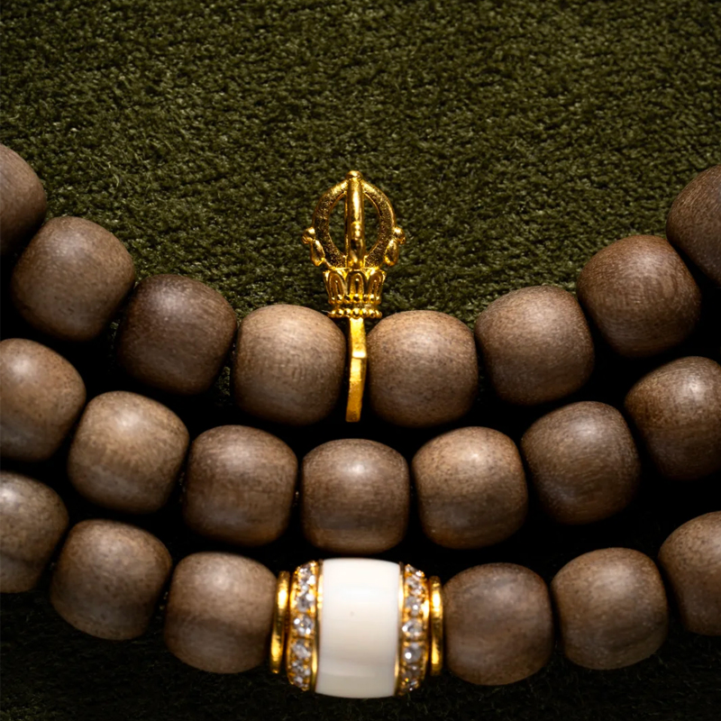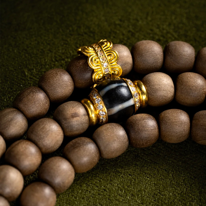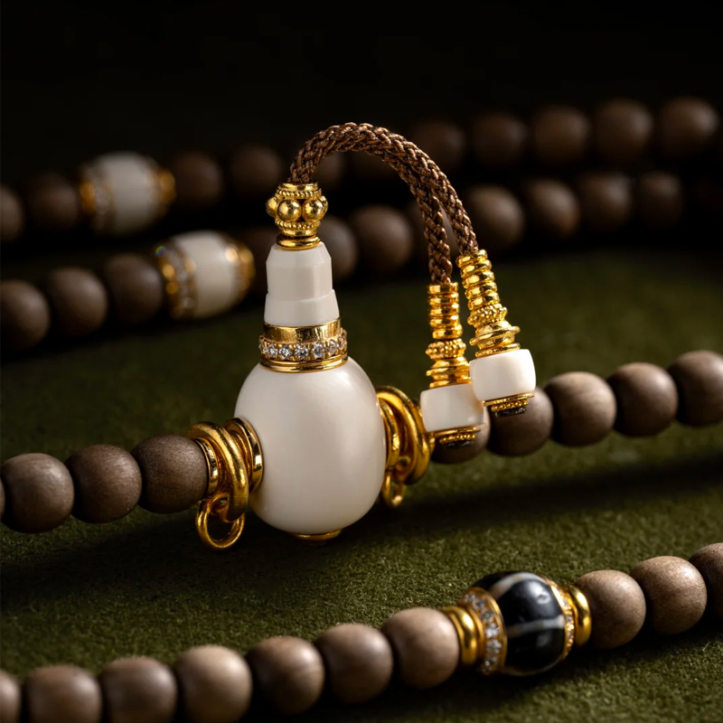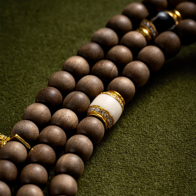 The mammoth ivory accents on the bracelet exhibit a unique, lustrous sheen. Their warm texture, like the gentle patina of time, complements the Laoshan sandalwood’s inherent steadiness. The inclusion of antique beads further enriches the piece with profound traces of history. Each ancient bead seems to whisper tales of bygone eras, sparking endless imagination.