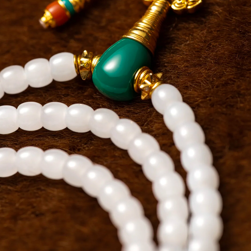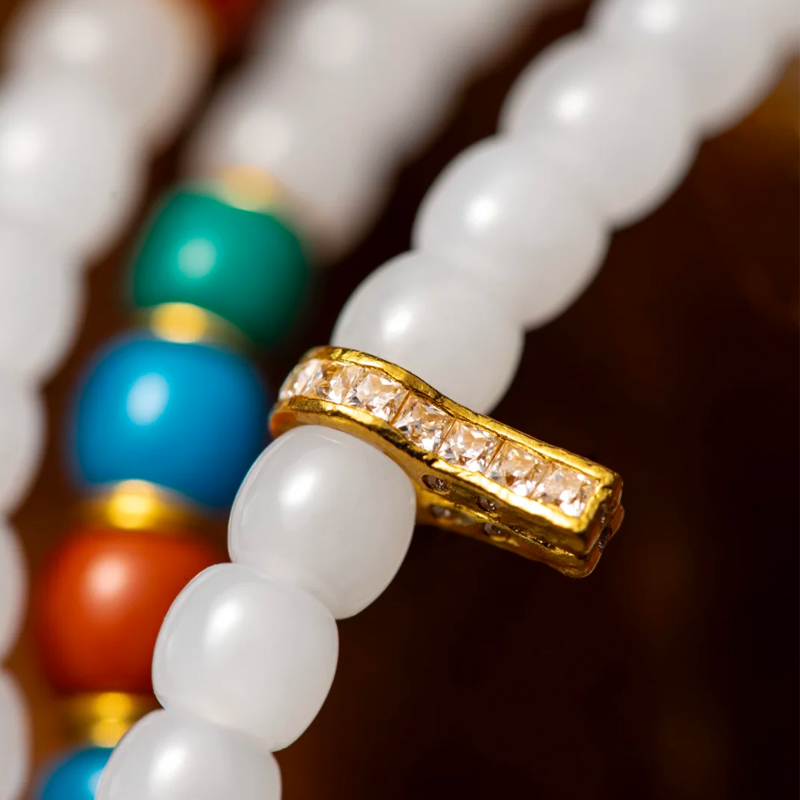 Crafted from Hetian white jade, the bracelet’s warm and serene texture seems to carry the weight of millennia, exuding a natural grace. Each jade bead is perfectly rounded and smooth, warm to the touch, evoking a sense of tranquil harmony that embodies the understated beauty of Eastern jade.