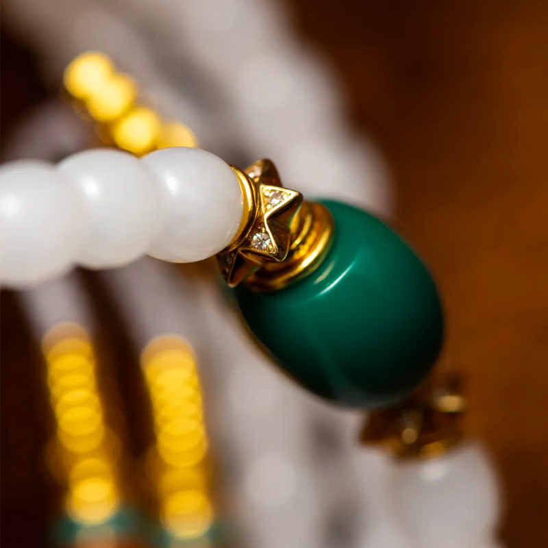 Against the pristine white jade, aged oil-green turquoise, vibrant blue-green turquoise, and southern red are artfully paired. The deep, reserved hues of the aged oil-green turquoise contrast sharply with the cool, vibrant blue-green turquoise, creating a striking interplay of warm and cool tones. The accents of South Red serve as the perfect finishing touch, its vivid red adding a passionate note to the bracelet. This blend of freshness and warmth embodies the unique restraint characteristic of Chinese aesthetics.