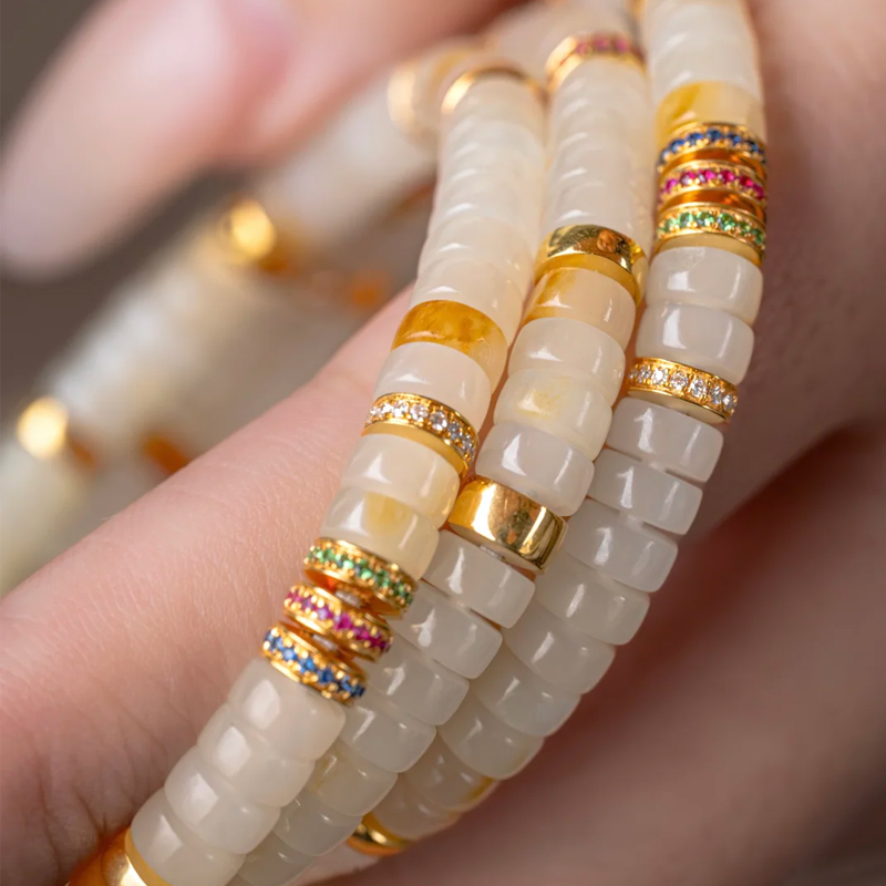 If the jade beads embody understated nobility, the gold, diamonds, and colored gems serve as the crowning glory. Minimalist 18K gold spacers are artfully integrated between the jade strands, where golden radiance and jade hues interplay, radiating an understated, refined luxury. Interwoven with rainbow-hued gemstone spacers—ruby, sapphire, tsavorite, and more—these vibrant accents infuse timeless jade with contemporary vitality. This pairing preserves jade’s Eastern Zen essence while embracing modern aesthetics through exquisite details. Worn on the wrist, it embodies cultural heritage and fashion-forward style.