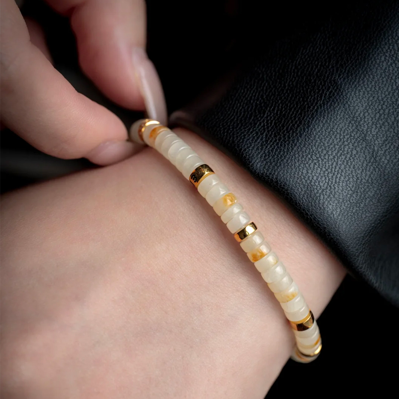 Each bead is meticulously selected from the same seed jade source, preserving its natural skin color and pores—the exclusive signature of its origin. The jade’s exceptional fineness renders its structure nearly invisible to the naked eye, while its oily luster is entirely natural. Without any polishing, it radiates a “glossy sheen” that is refreshingly non-greasy, as if capturing the soft glow of millennia-old riverbeds on your wrist. The skin color accents dance like scattered gold—golden yellow or ochre red—creating a subtle contrast with the jade’s milky white luster. It resembles an ink-wash painting, expressive yet restrained.