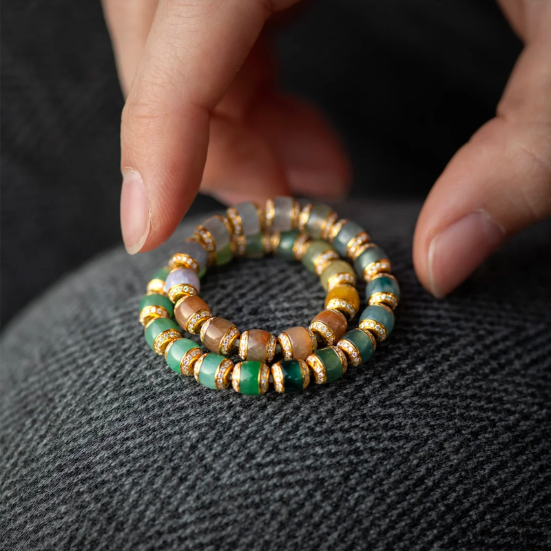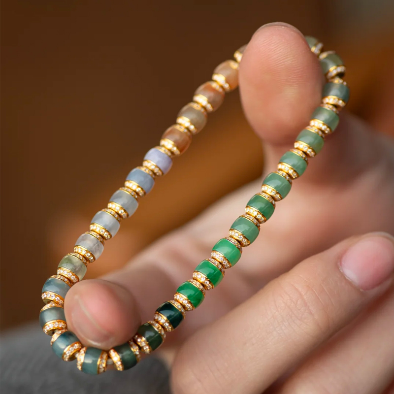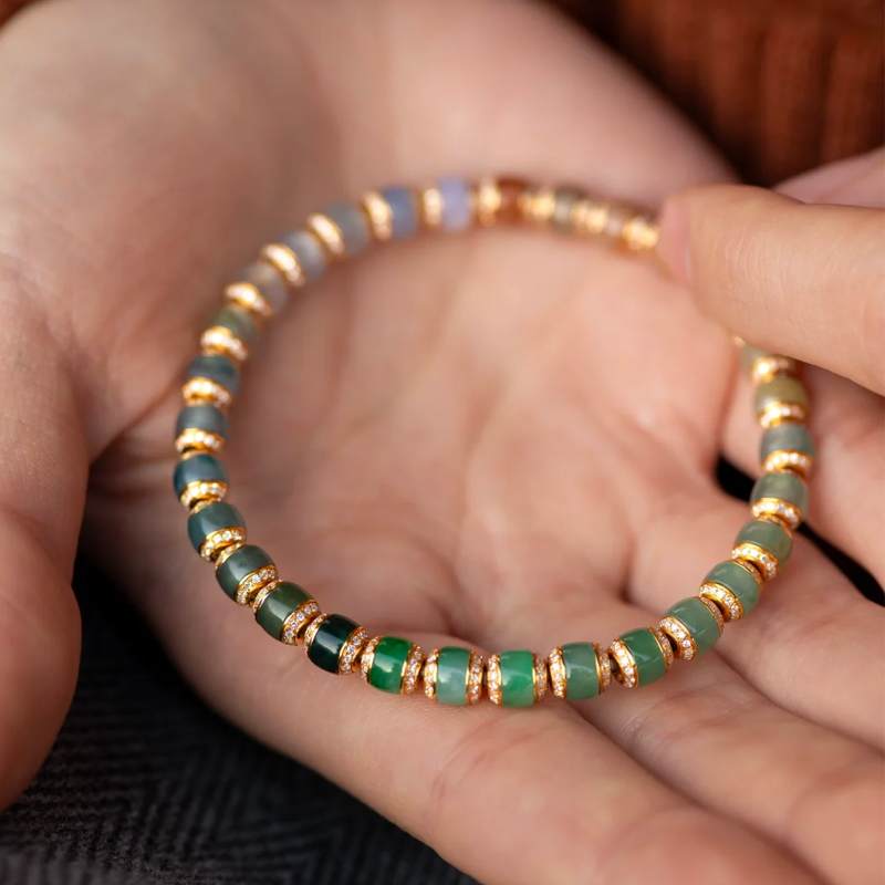 This is an 18K gold jadeite bracelet featuring diamonds, showcasing every color spectrum of jadeite. You’ve likely seen countless identical jadeite pieces before—no matter how high-quality, they always feel distant. If you want to stand out in the jadeite world and truly “rise above the rest,” this is an absolute must-have.