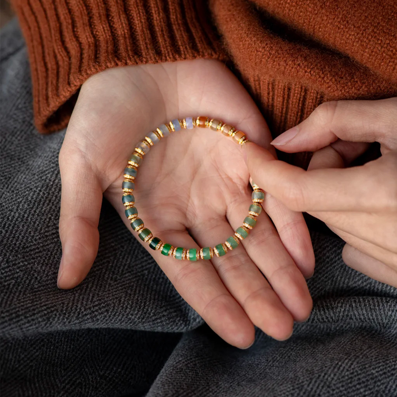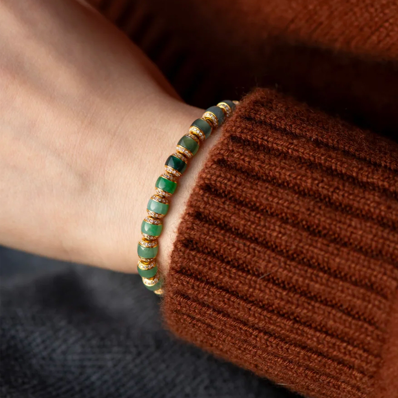 The transition between cool and warm tones is exceptionally smooth, mastering jadeite’s colors to create a fashion-forward statement. Crafted in 18K gold with diamond-cut pearls, the gold links connect seamlessly, significantly enhancing its jewelry appeal. This piece proves jadeite isn’t just for a certain age—it can be refined and trendy.