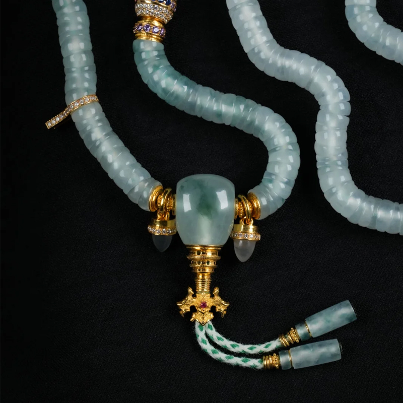Renowned for its high hardness, jadeite incurs significant cutting losses, making the carving of each bead a supreme test of the artisan’s skill. The design team reimagined the traditional form through a jewelry lens, integrating color gradient logic into the classic abacus-style cut. While preserving jadeite’s natural patterns, intermittent accents of 18K gold and colored gemstones soften the material’s inherent rigidity, highlighting its luminous vitality. Particularly notable is the tripartite Buddha head paired with gold and diamond accents. Exquisite openwork craftsmanship achieves imperial-grade detailing, endowing the piece with the relaxed elegance of a cultural artifact while retaining the opulent aura of fine jewelry.
