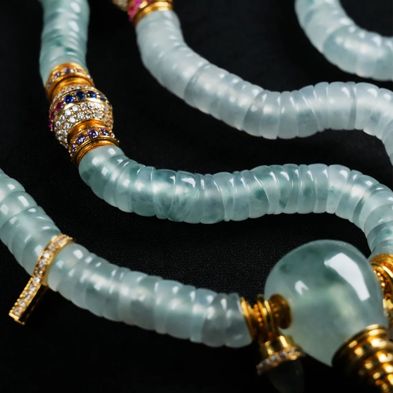 The rigorous selection of jadeite raw materials and high-waste processing ensure this bracelet transcends ordinary adornment. Each “intestine bead” requires meticulously chosen jadeite sections matching both hue and translucency—a single misstep during cutting renders the entire effort futile. The bespoke gold and diamond accents demand precise color harmony—cool gold complements blue-water jade, while rose gold pairs with lychee-frosted jade. This color philosophy guides every detail. Such dual demands on material and craftsmanship imbue the piece with a “one-of-a-kind” collectible quality—a refined daily companion and a jewel worthy of heirloom status.