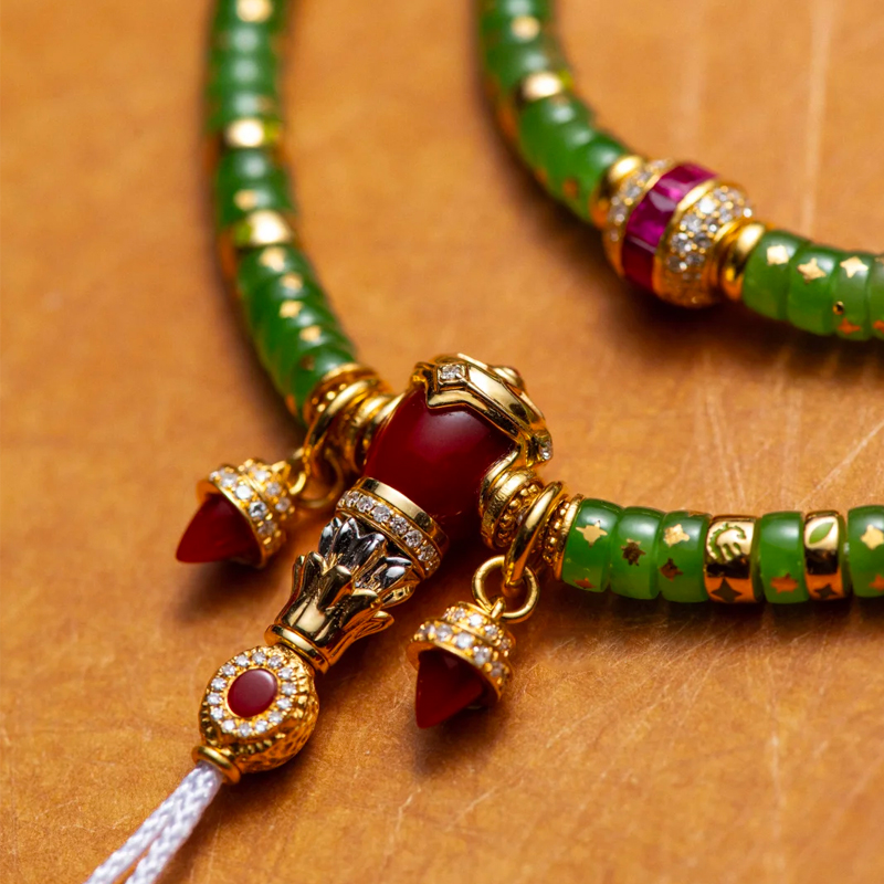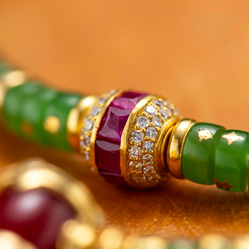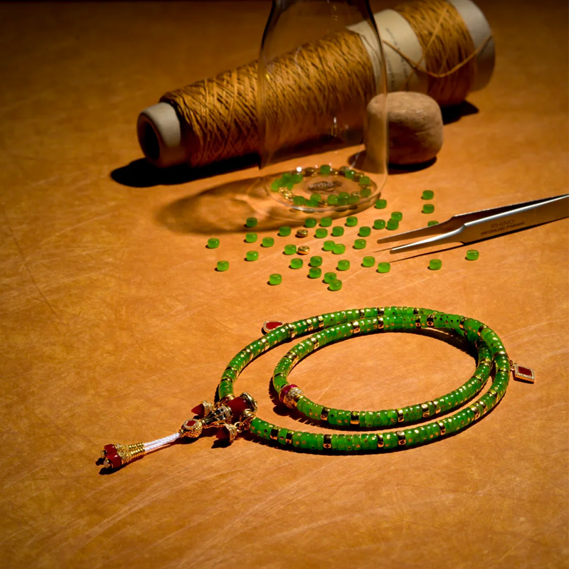 Crafted from vibrant “apple green” jadeite, its rich, vivid hue evokes the fresh buds of spring, brimming with vitality. Paired with the vivid aka, the contrasting yet harmonious colors add a striking pop of brilliance to the bracelet.
