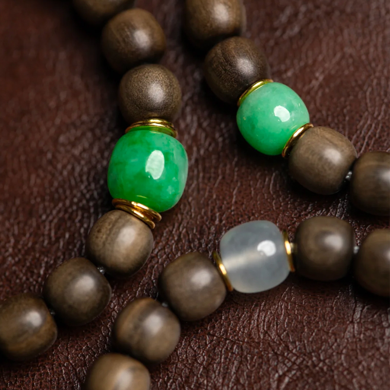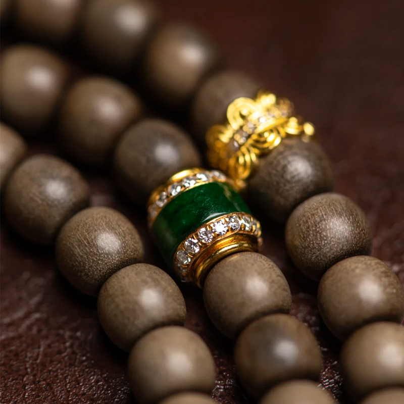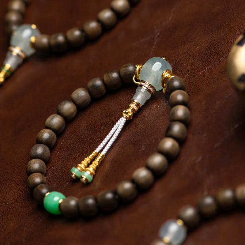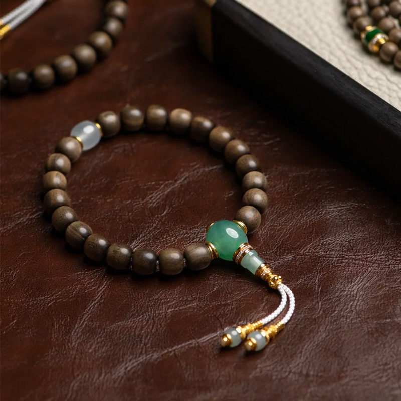 The bracelet’s accessory design is exquisitely crafted, adding a touch of grace and elegance to the whole. Emerald-green jade beads, like spirited jade fairies, form a striking yet harmonious contrast with the deep tones of the Laoshan sandalwood, infusing the bracelet with vitality and energy. The pale jade accents, warm and gentle, complement the texture of the Laoshan sandalwood, adding a touch of graceful beauty. Golden spacers and an exquisitely crafted three-way Buddha head shimmer with noble radiance, elevating the bracelet’s opulence while highlighting its unique taste and style. White tassels cascade gracefully, swaying with the wrist’s gentle motion to add an air of ethereal movement, fully embodying Eastern charm.
