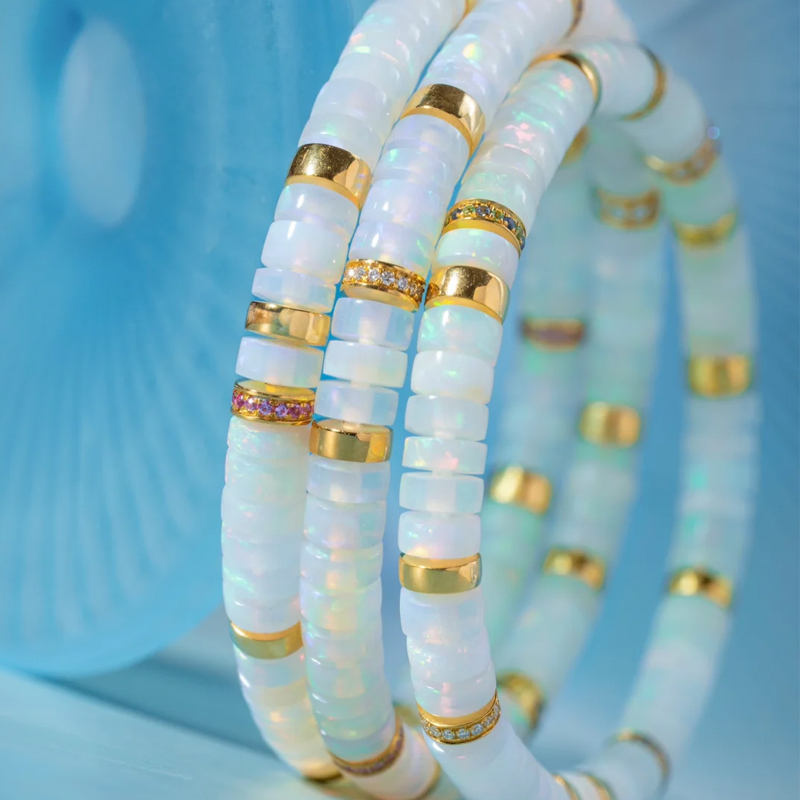 This Opal Diamond bracelet is a poetic masterpiece, as if the Milky Way were captured on your wrist. Inspired by a “stellar fantasy,” the designer meticulously selects rare African opal rough, with each stone meeting stringent criteria of “full fire and flawless clarity”—a selection rate under 1%—ensuring the beads radiate a nebula-like, crystalline iridescence. The 22K gold and diamond accents are custom-molded with 1:1 precision, seamlessly integrating with the opal beads. Every detail reflects the original design’s unwavering commitment to quality.