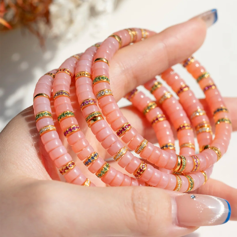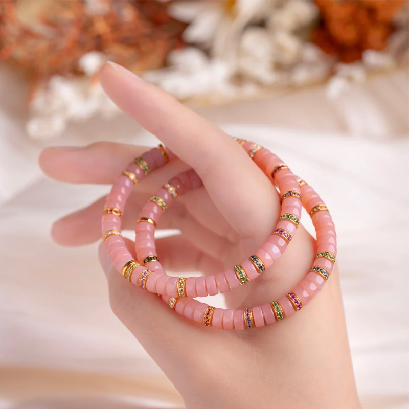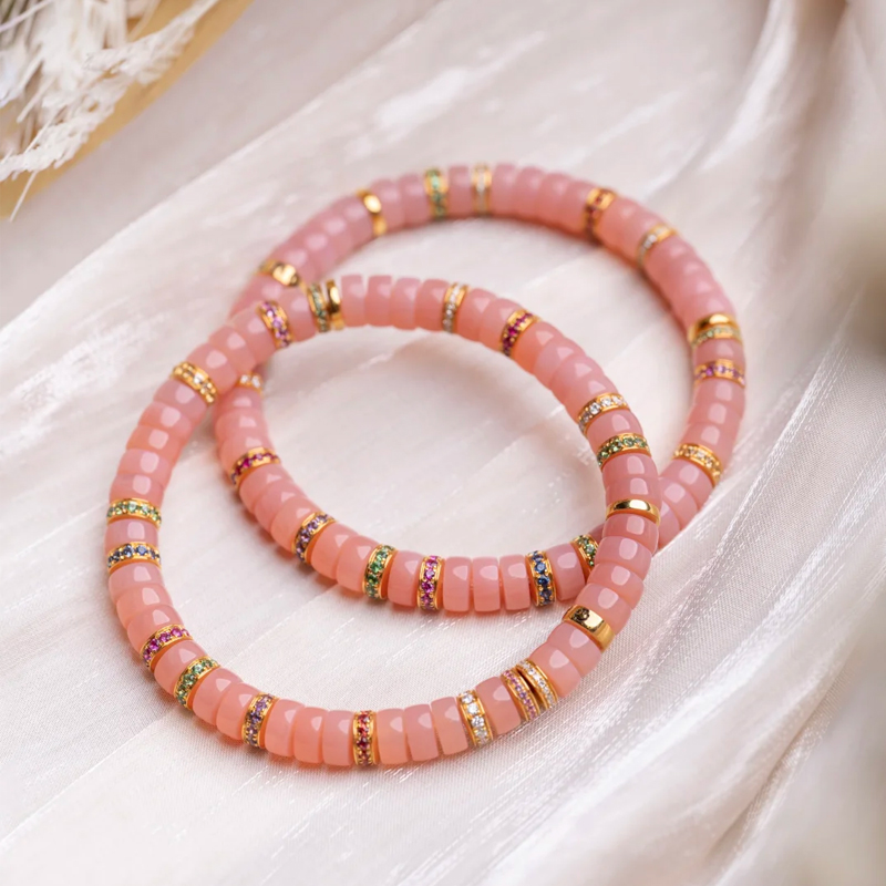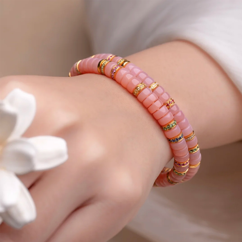 Diamonds and colored gemstones infuse the bracelet with vibrant energy. Tiny diamonds, like scattered stars, sparkle brilliantly under light, adding a dazzling charm. The colored gemstones resemble splashes of paint on a pink canvas, where shades of purple, green, and blue intertwine with the pink hues, creating a vibrant and colorful scene. This blend gives the bracelet a soft yet playful and whimsical quality.