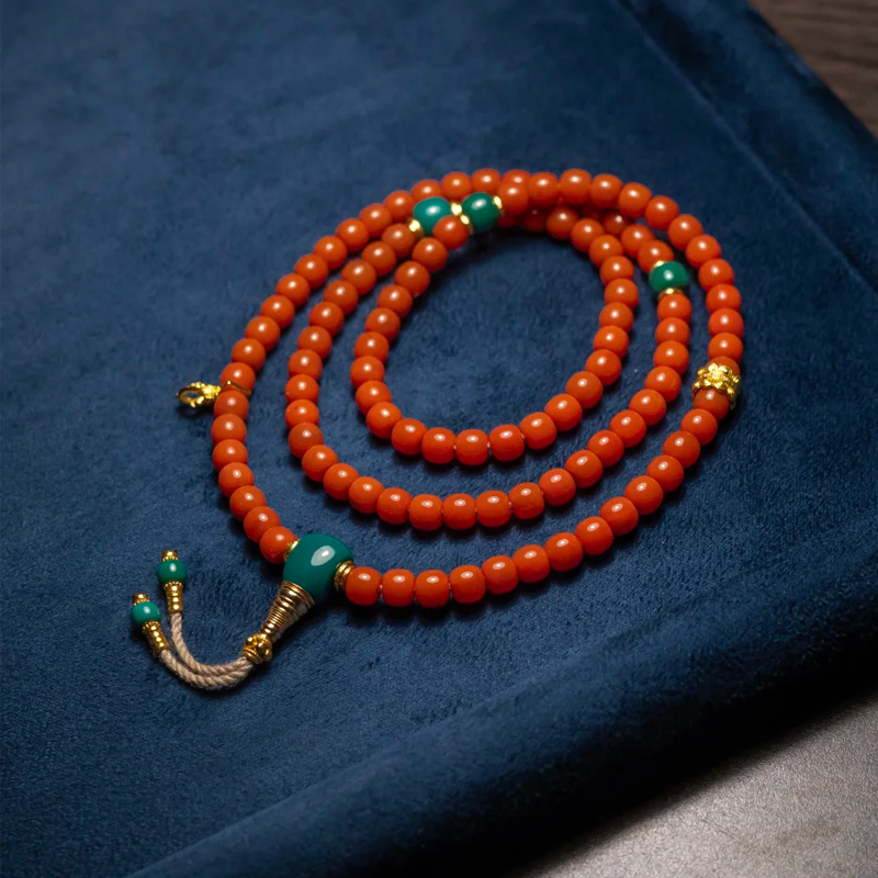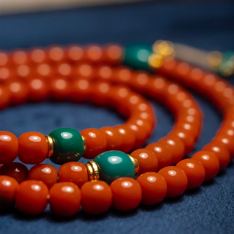 Inspired by Qing dynasty court beads, proportions are meticulously calibrated: 5.5mm beads strike a delicate balance, preserving classical dignity while adapting to modern wear. Between the turquoise three-way connectors and the South Red bead strands, gilded spacers serve as accents—protecting the beads from wear while adding an air of regal elegance. The tassel features small turquoise beads in matching hues, where rope craftsmanship intertwines with goldsmithing. With each swaying step, it seems to whisper ancient melodies.