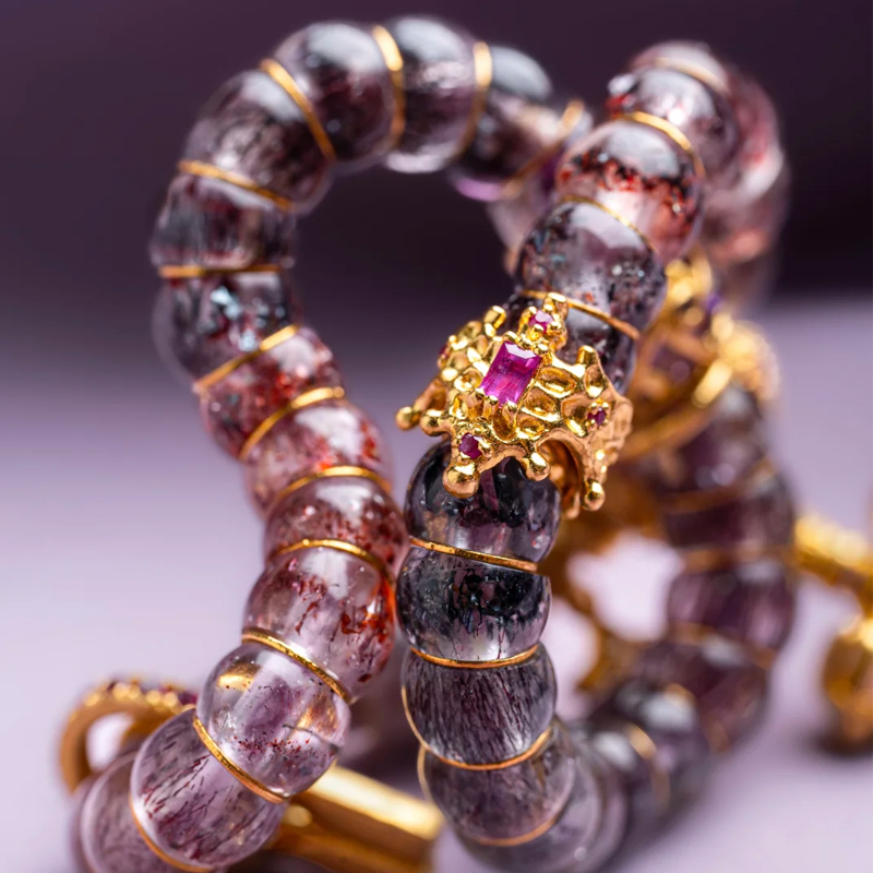 Super Seven Crystal, also known as “Super Seven” or “Melody Stone,” fuses multiple minerals including clear quartz, smoky quartz, amethyst, rutile, goethite, hematite, and pyrophyllite. Each bead in this bracelet is meticulously crafted from premium Super Seven Crystal, shaped into distinctive intestine-like forms that are plump and rounded—each resembling a carefully sculpted work of nature.