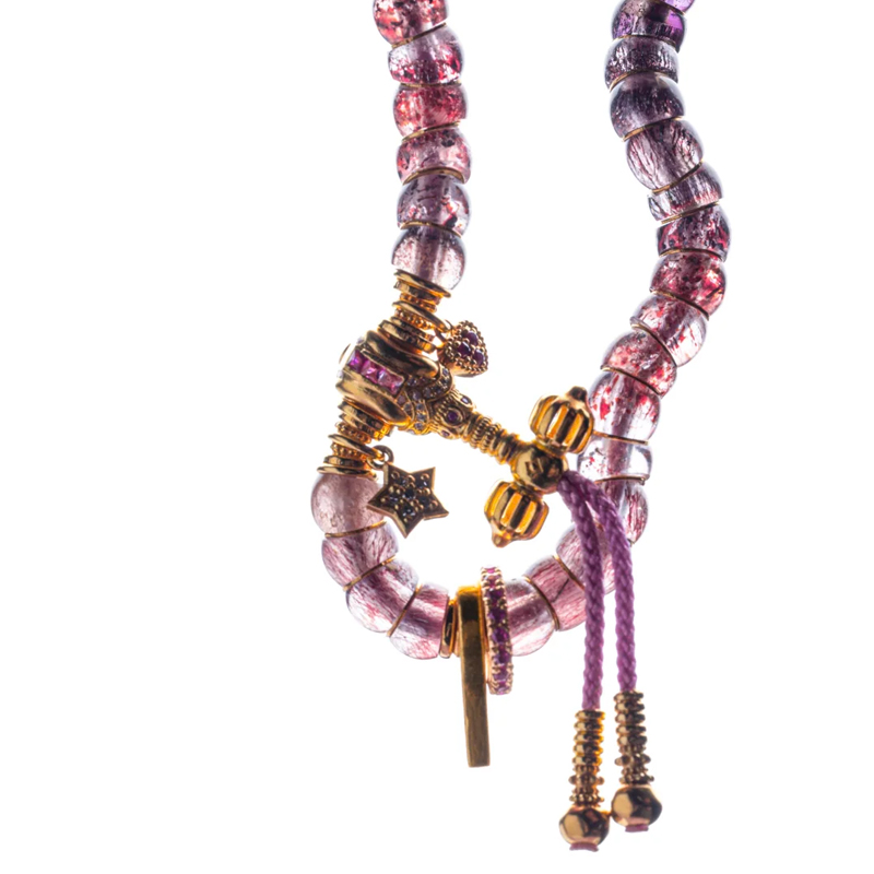 Golden accents on the bracelet lend an air of luxury and prestige. The gold spacers, intricately carved components, and exquisite pendants harmonize with the Super Seven crystal’s iridescence, amplifying its opulence. Some gold accents are further adorned with purple gemstones, echoing the Super Seven crystal’s hues and elevating the bracelet’s overall aesthetic. The pendants, featuring designs like stars and cross-shaped maces, not only enhance the bracelet’s ornamental appeal but also imbue it with deeper cultural significance and symbolic meaning.
