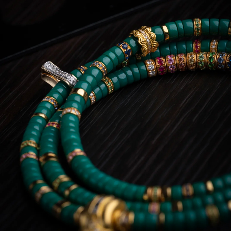 Choosing our Turquoise and Gold Diamond 108-Bead Set Bracelet means embracing distinctive taste and depth. Let it accompany you on life’s journey, radiating a unique brilliance.