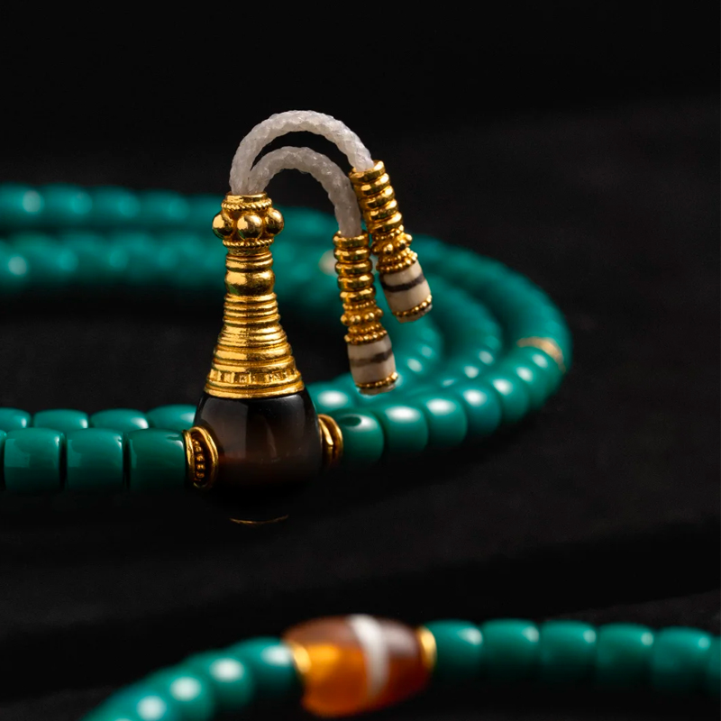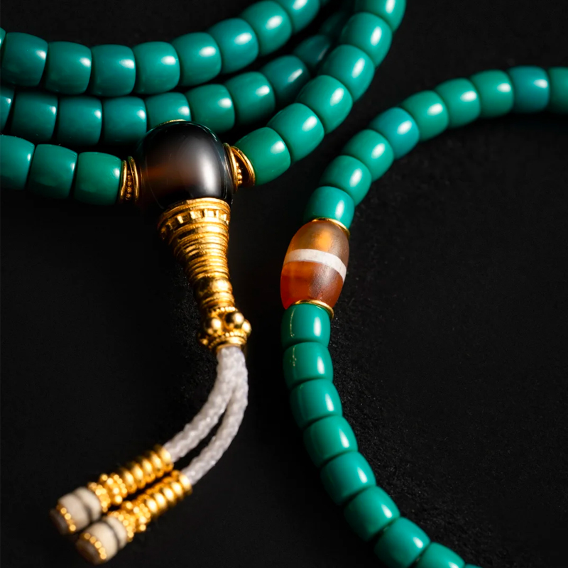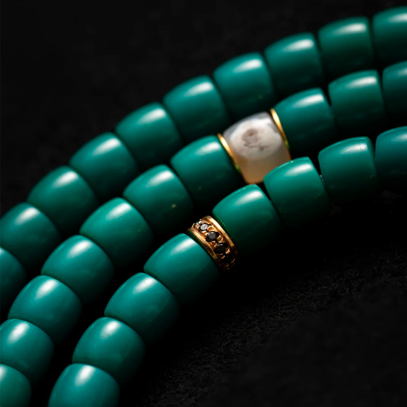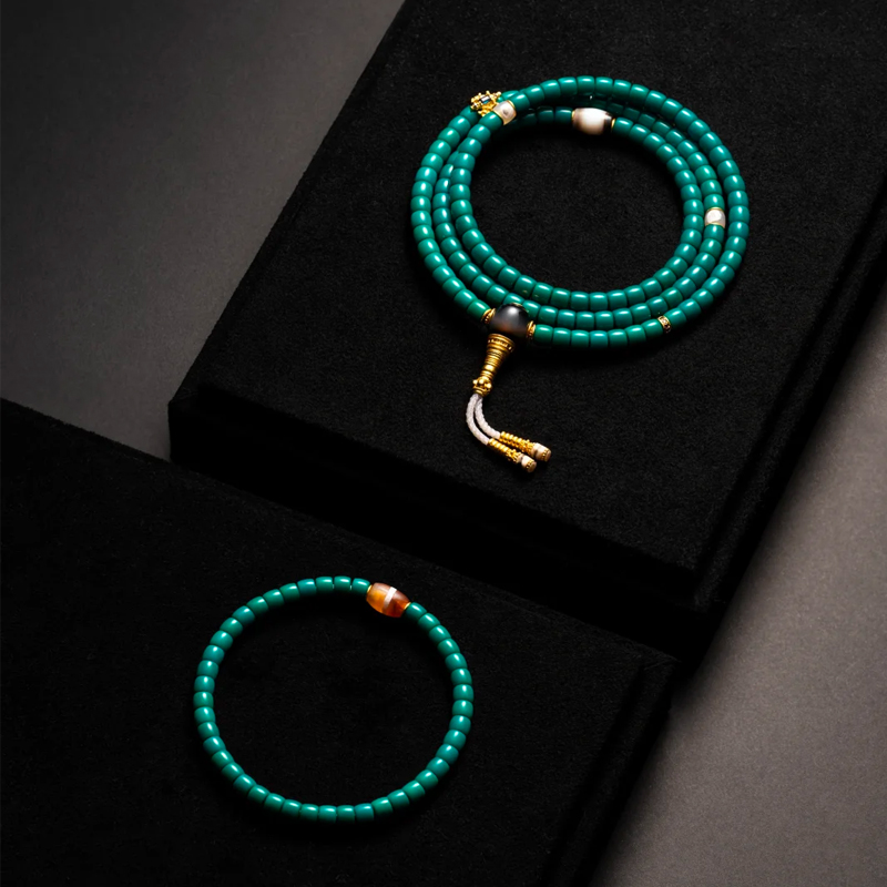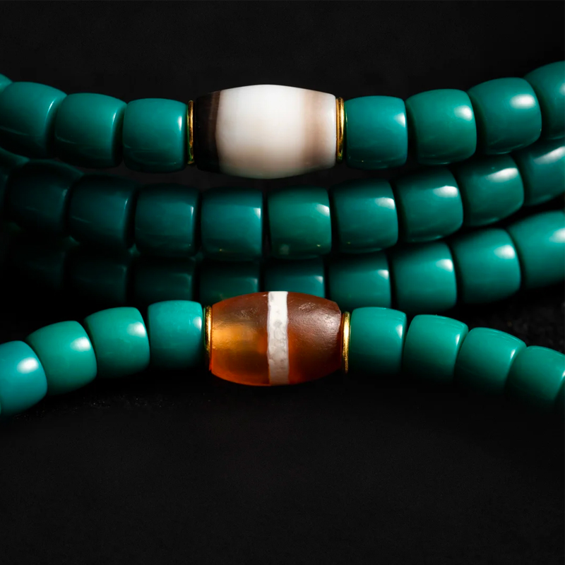 This compact yet fully-equipped [Xunyang Old Oil Green] straight-cut set bracelet exemplifies both quality and design. It pairs millennia-old beads in black and white with red chalcedony, exuding understated sophistication. The ancient beads, weathered by time, exude an air of rustic mystery. Paired with the warm, lustrous turquoise, they seem to whisper tales of antiquity.