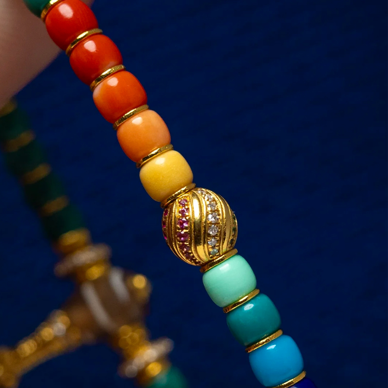 The unique rainbow segment design creates a seamless color transition, evoking a delightful dopamine-inducing atmosphere—as if holding a vibrant rainbow in the palm of your hand. Red agate beads serve as spacers, their warm, aged patina complementing the overall layered effect and adding a distinctive charm.
