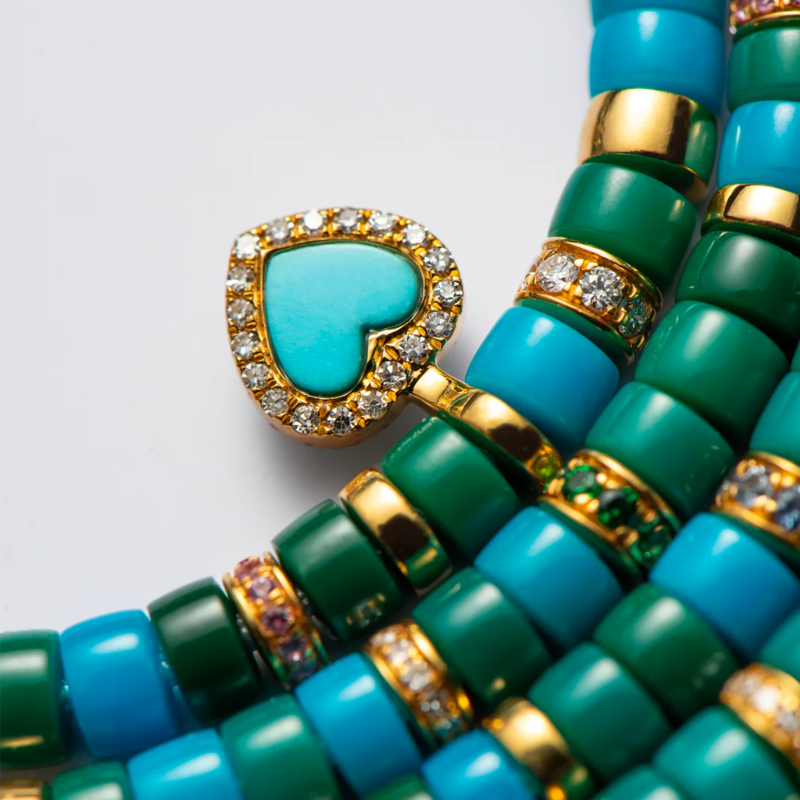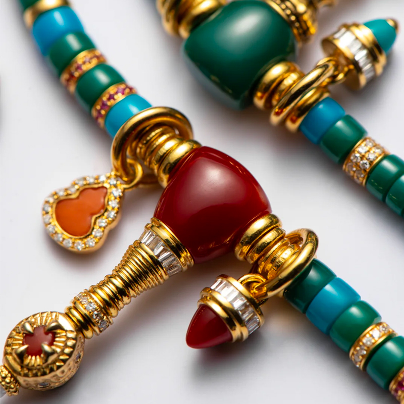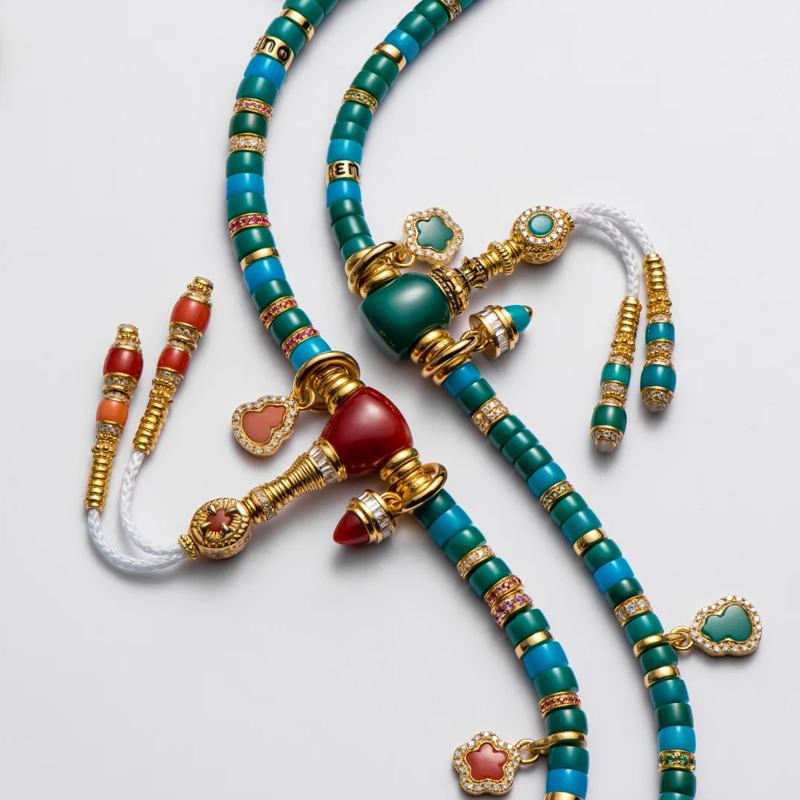 Each bead boasts high porcelain-like luster and intense color, with flawless clarity under light—no cracks or iron lines. One strand features an all-turquoise design, where beads blend seamlessly while retaining subtle layered depth. The other employs a bold color-blocking technique, where cool and warm tones collide to create a strikingly vibrant effect.