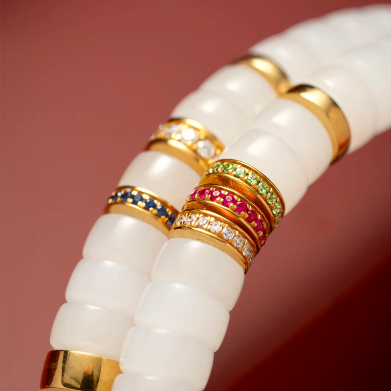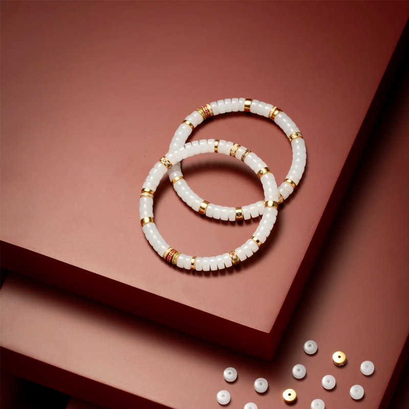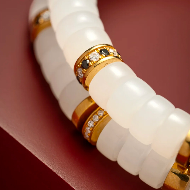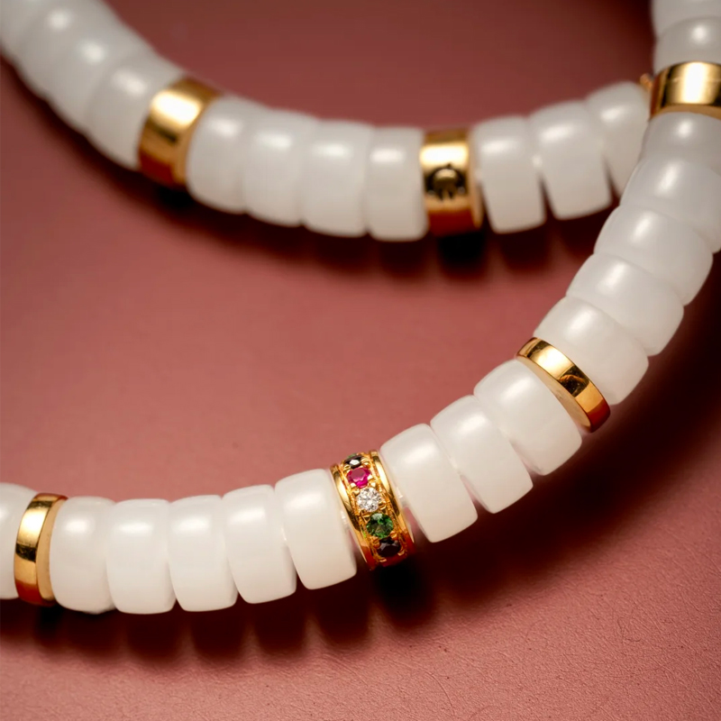 This 6mm-sized [White Jade and Gold-Diamond Bracelet] perfectly blends the gentleness of white jade, the splendor of gold diamonds, and the brilliance of gemstones. With an air of sophistication and cool elegance interspersed with liveliness and refinement, it is a precious item that those pursuing quality and aesthetics should not miss.