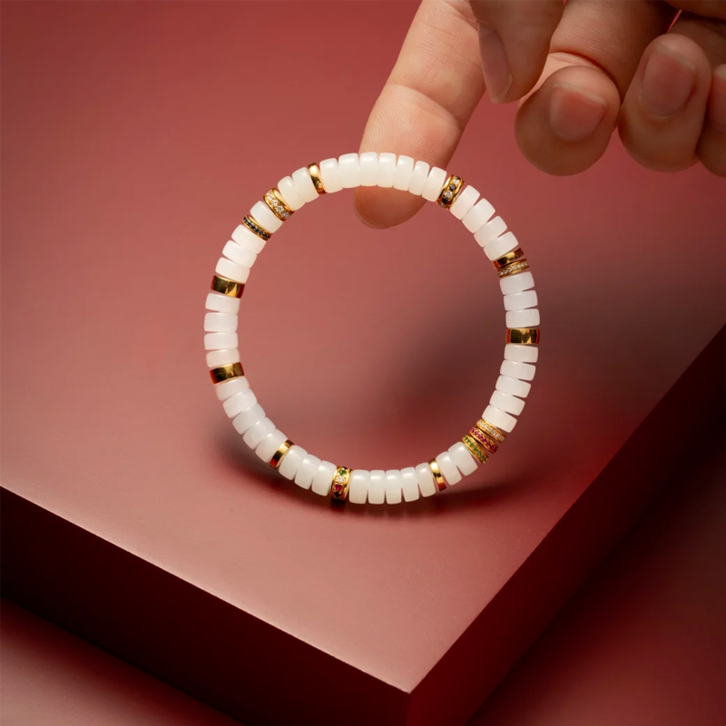 The uniqueness of the bracelet also lies in the clever incorporation of 22K gold diamonds and colored gemstones. The 22K gold shines with a soft yet noble luster, complementing the gentle white jade beautifully. The embellishment of colored gemstones adds a touch of vibrant color to the entire bracelet, instantly making it exquisitely refined and exuding a strong jewelry aura. Whether worn daily or on important occasions, it can become the center of attention.