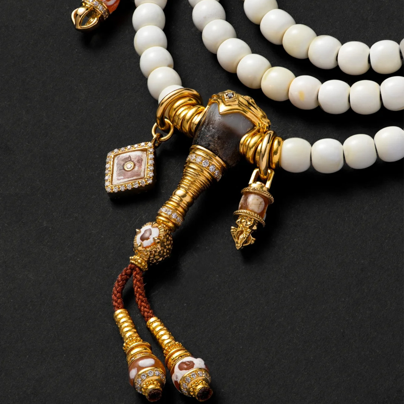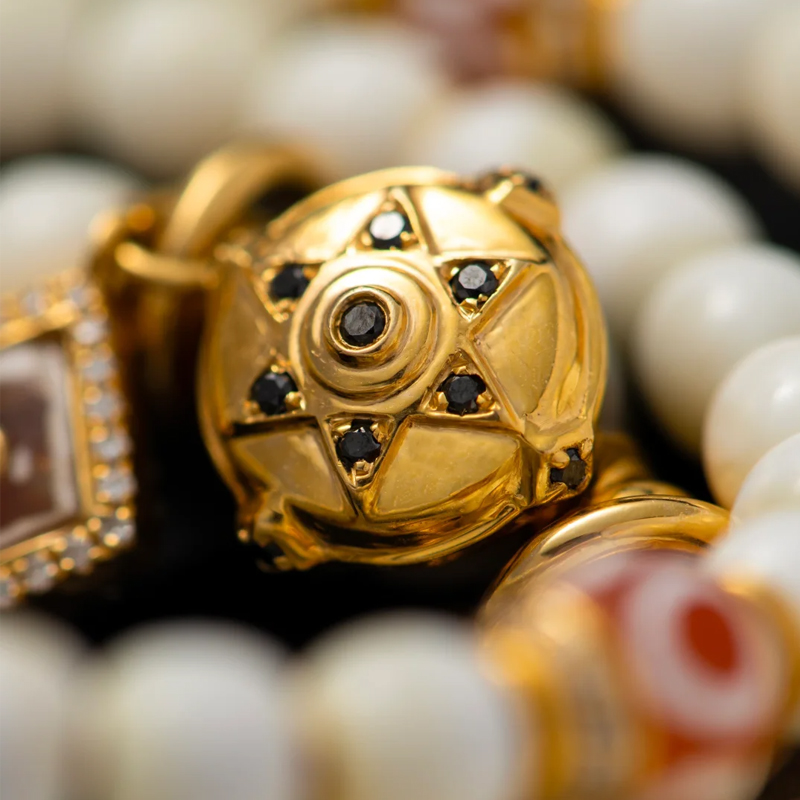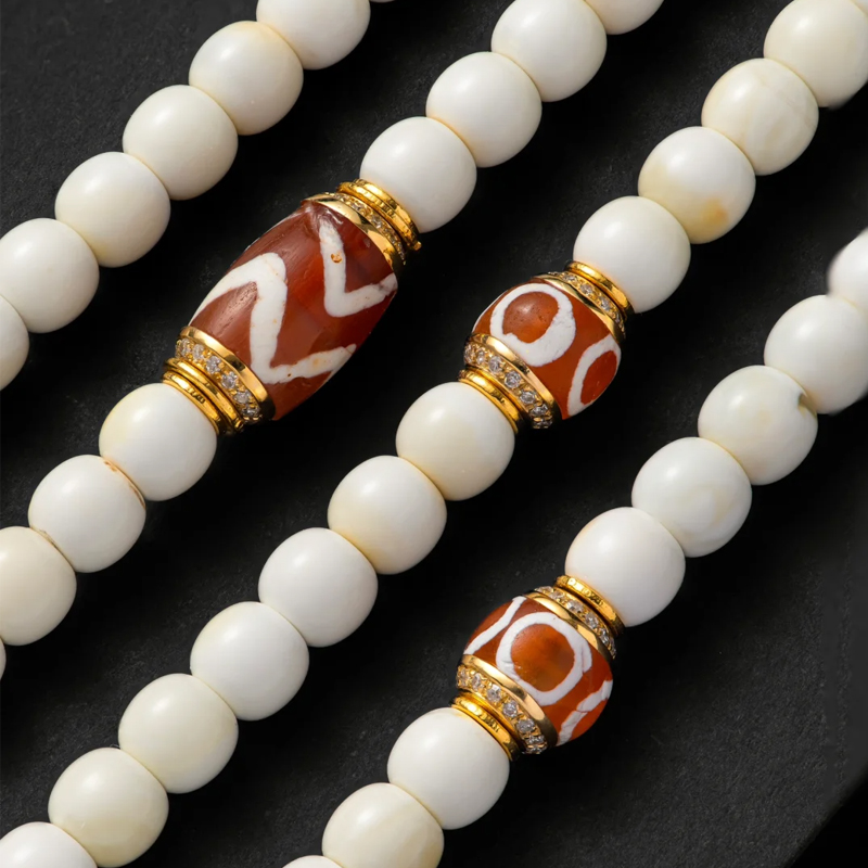 The accessories within the set add a brilliant chapter to the bracelet. Golden spacers, pendants, and other components radiate an aura of nobility, creating a striking yet harmonious contrast with the white wax’s understated elegance. Gold, an age-old symbol of luxury and prestige, here elevates the white wax with its intricate forms and delicate craftsmanship. Some accessories are further adorned with sparkling diamonds or vibrant gemstones, like twinkling stars in the night sky, infusing the bracelet with a sense of vitality and opulence. The incorporation of distinctive elements like Tibetan beads not only enriches the visual layers of the bracelet but also imbues it with profound cultural significance and an air of mystery.