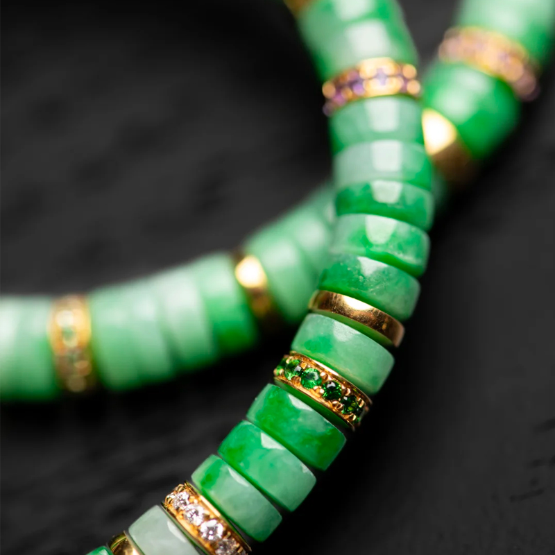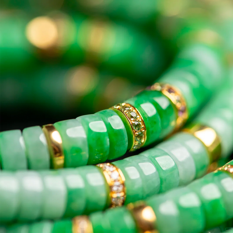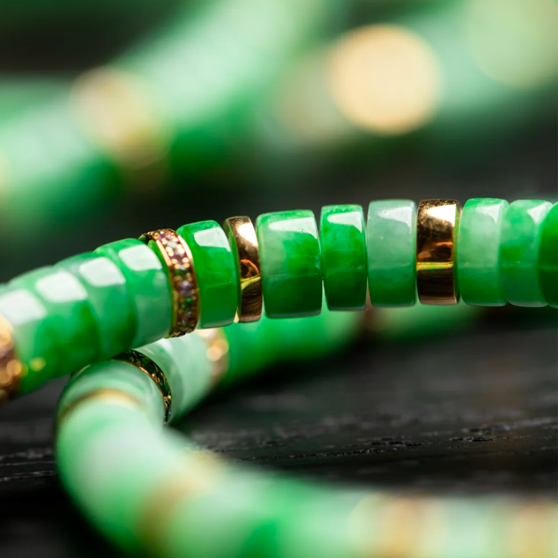 Golden spacers interspersed throughout the bracelet lend an air of luxury. The gold complements the vibrant green of the jadeite, creating a striking color contrast that accentuates the jade’s vivid hue while elevating the bracelet’s opulence. The intricate patterns on the gold spacers further enhance the bracelet’s refinement, showcasing unique taste and style.